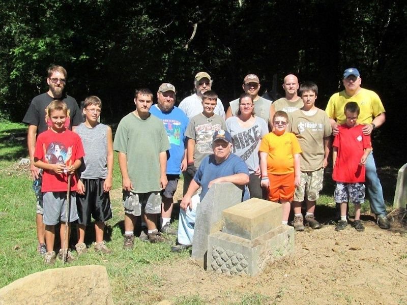 On September 3rd, the Saturday prior to the workshop, a group of Boy Scouts from Troops 101 and 95 worked in the historic section of the Center Point Cemetery cleaning up around the stones in preparation for the workshop. The workers pruned trees, removed yucca plants, and filled a large dumpster with limbs, weeds, vines, and other plant materials. They also cleaned along the north edge of the cemetery making it possible to mow around the stones that were near the edge of the woods.